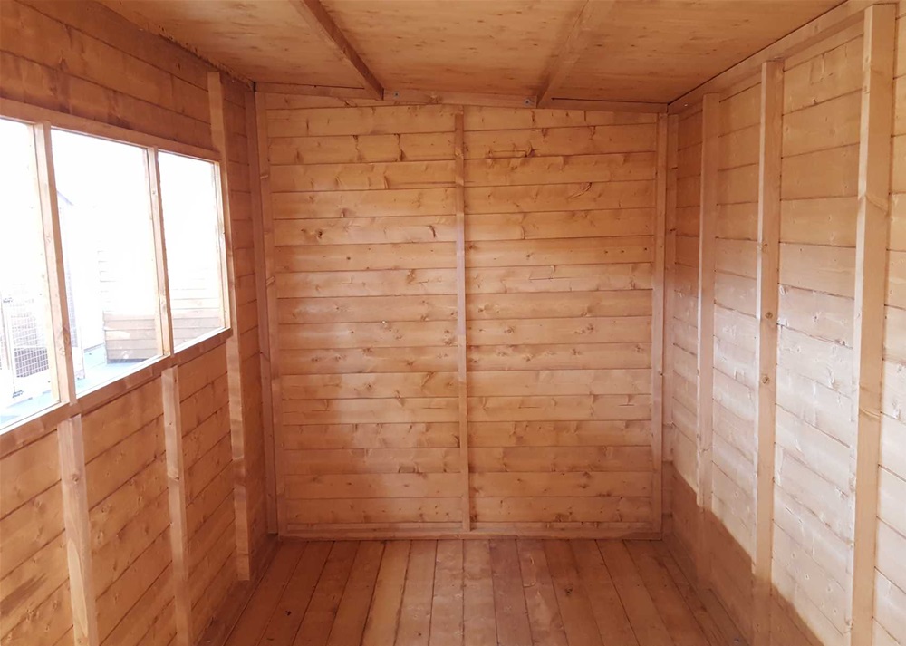 Tongue and groove shed with pent roof, push locks and toughened glass.