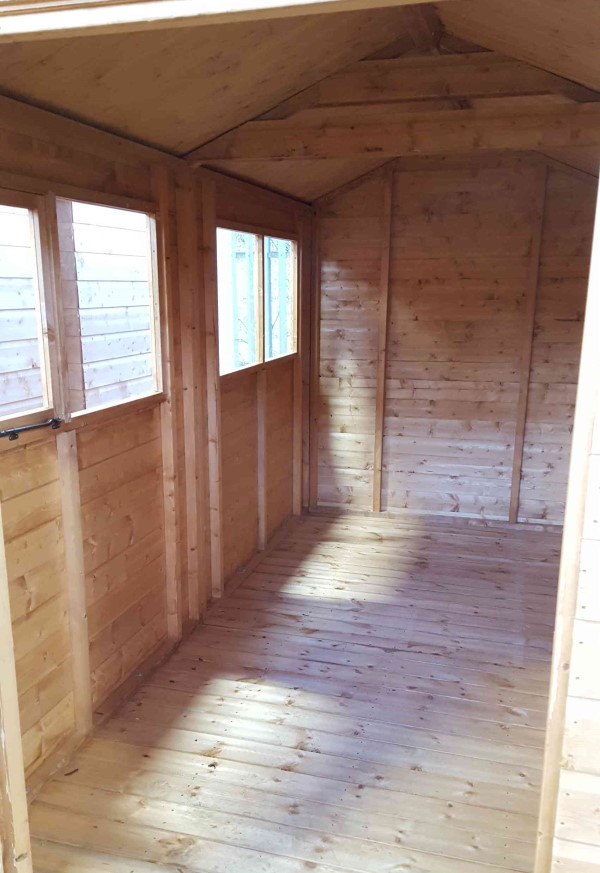 Tongue and groove shed with apex roof, push locks and toughened glass.